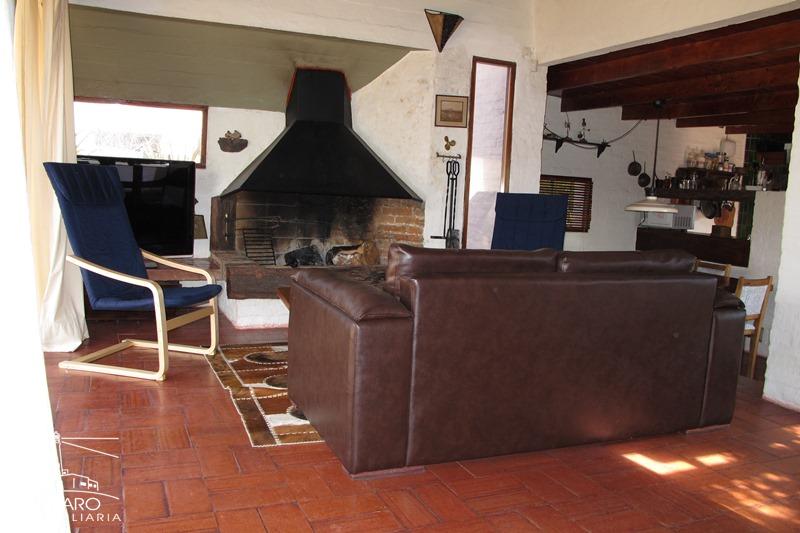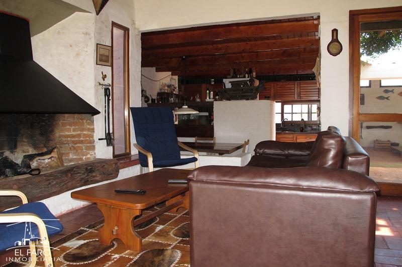 Living con estufa a leña, con amplio ventanal al frente y puerta ventana en L que al abrirse se integra a patio interior con sombra de jazmín.