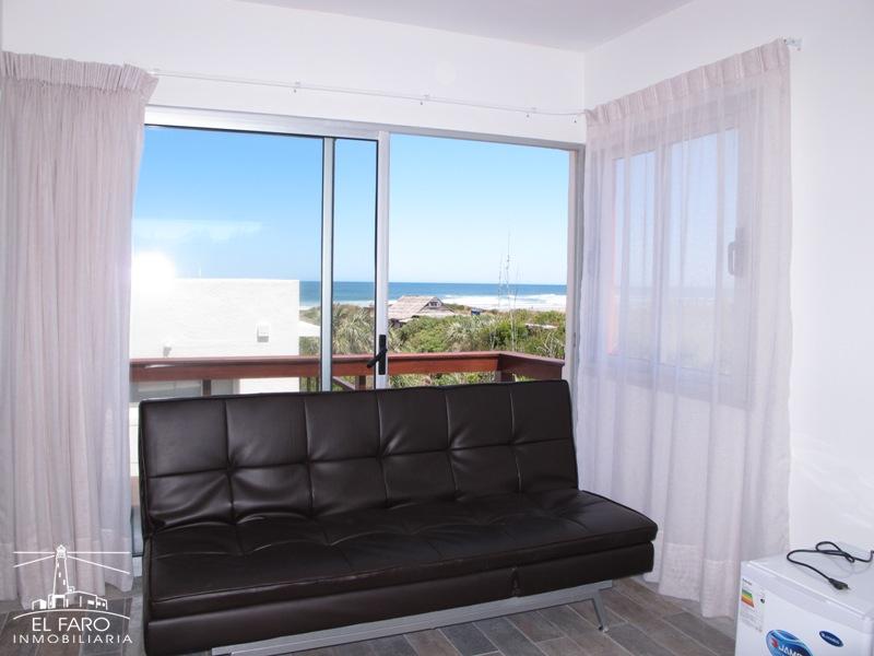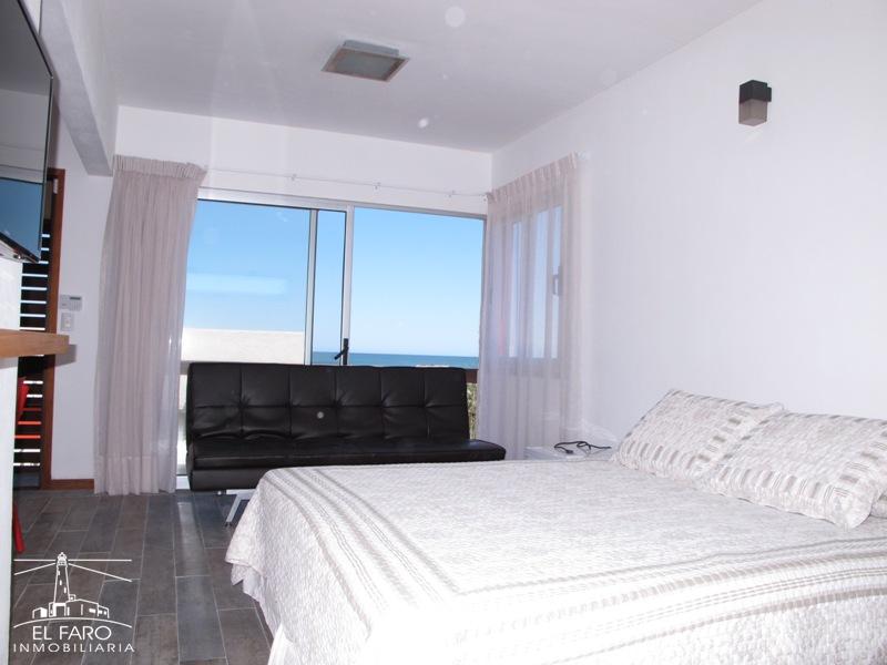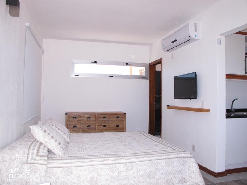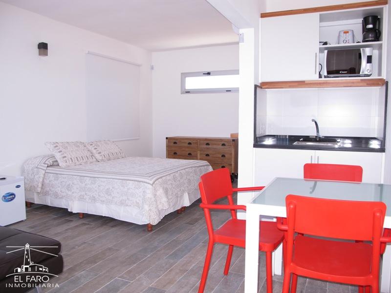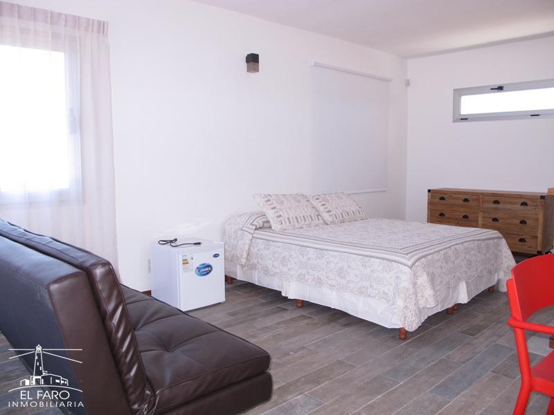 Monoambiente luminoso con cama matrimonial y sofá cama.