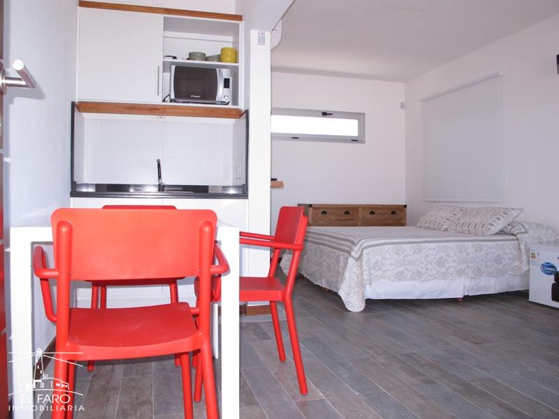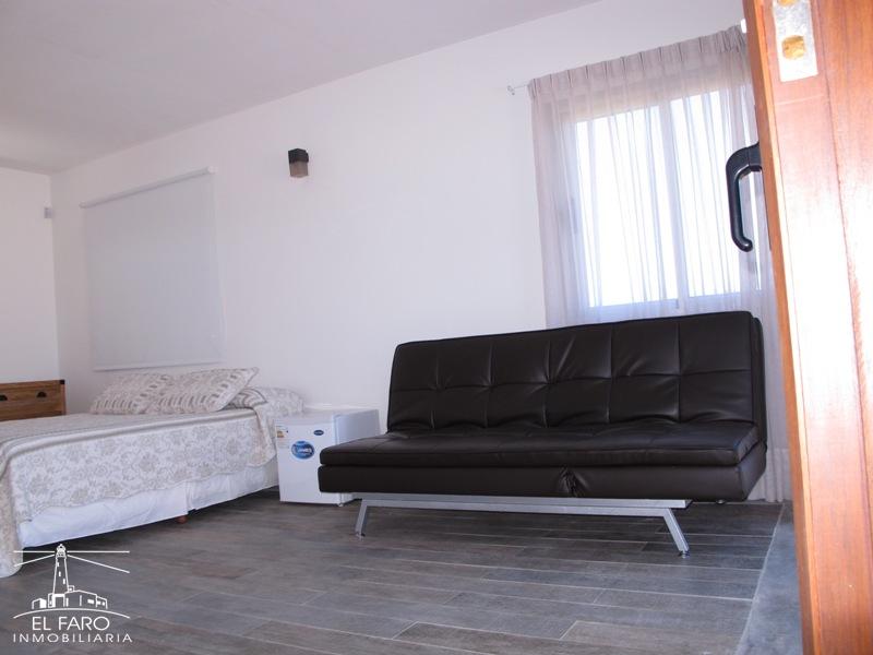 Monoambiente luminoso con cama matrimonial y sofá cama.