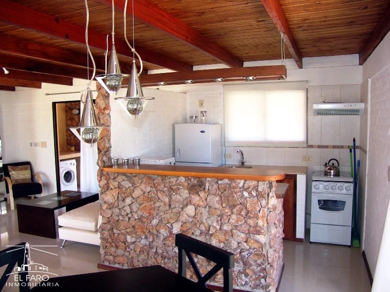 Living comedor, cocina. Ventanales con salida a parrillero y deck. Baño.